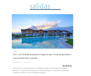 Medio: Radio Suquía La empresa Fractional Class ofrece en Córdoba experiencias vacacionales de propiedades fraccionadas que se adquieren de por vida y con título perfecto. Una